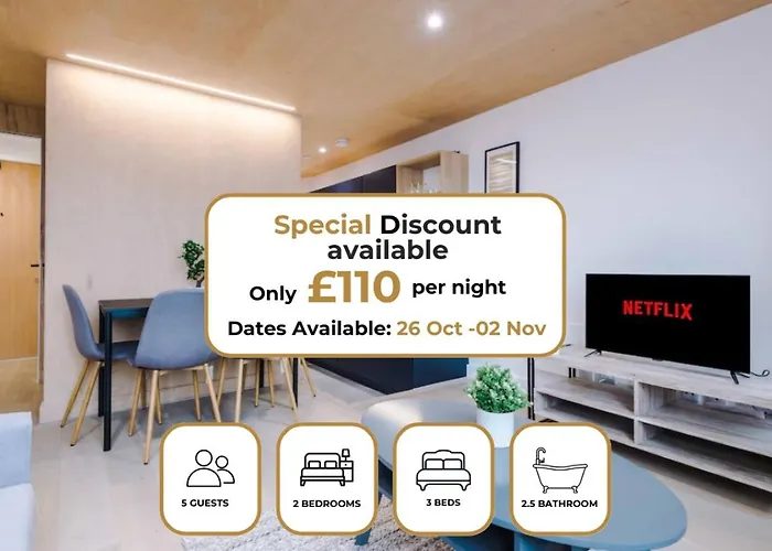 Modern Spacious Apartment Sleeps 5 Free High-Speed Wi-Fi ligger i Castlefield distriktet i Manchester og 20 km fra Manchester flyplassen. Denne innkvarteringen består av 2 soverom og 2 baderom.